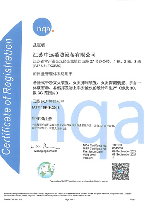 Jiangsu COSCO Fire Fighting Equipment Co., Ltd. is located at No. 27, Hongshan Road, Jincheng Town, Jintan District, Changzhou City, covering an area of 24,056m². The company is engaged in the research and development, production and sales of automatic fire extinguishing devices, fire protection equipment and equipment; security equipment manufacturing; intelligent vehicle equipment manufacturing; prevention system design and construction services, etc. Products are divided into four categories: civil, automotive, engineering, and mining. It has participated in the formulation of many industry standards, and has won honors such as High-tech Enterprise, Jiangsu Province Specialized and New Small and Medium-sized Enterprises, and Jiangsu Province Gazelle Enterprise, and has passed IATF16949, ISO9001, ISO14001, ISO45001 and other certifications.